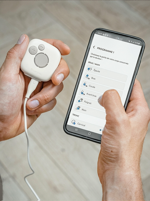 La technologie TENS pour une prise en charge de la douleur dans un petit appareil connectée à une Application mobile.