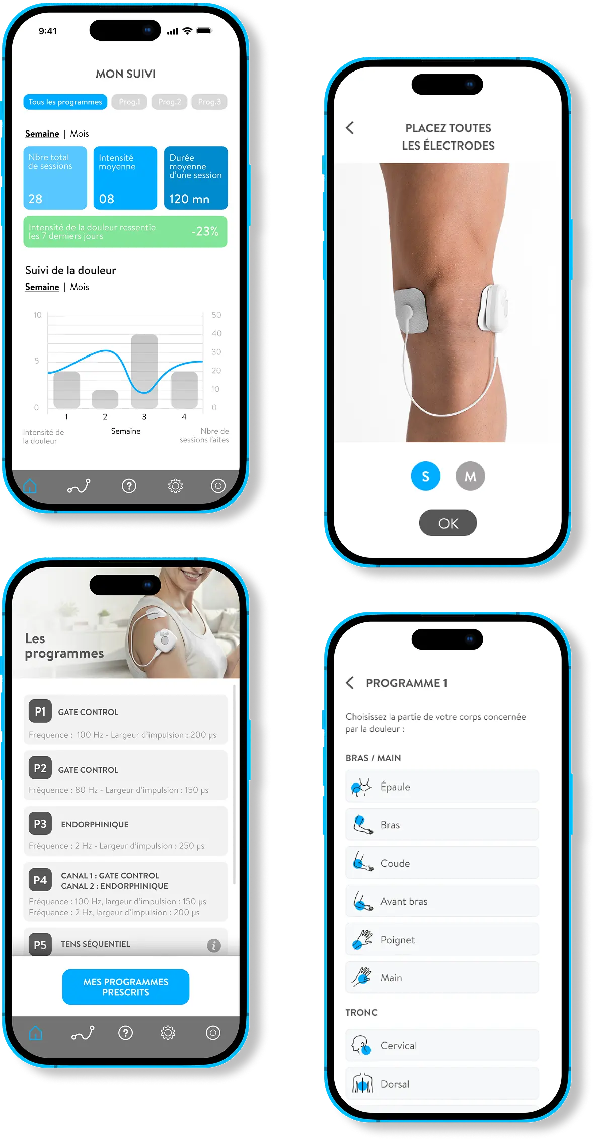 Des photos anatomiques guident le positionnement des électrodes selon la zone douloureuse, pour une pose précise, sécurisée et efficace.